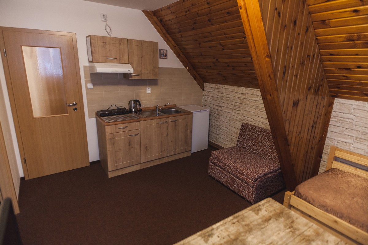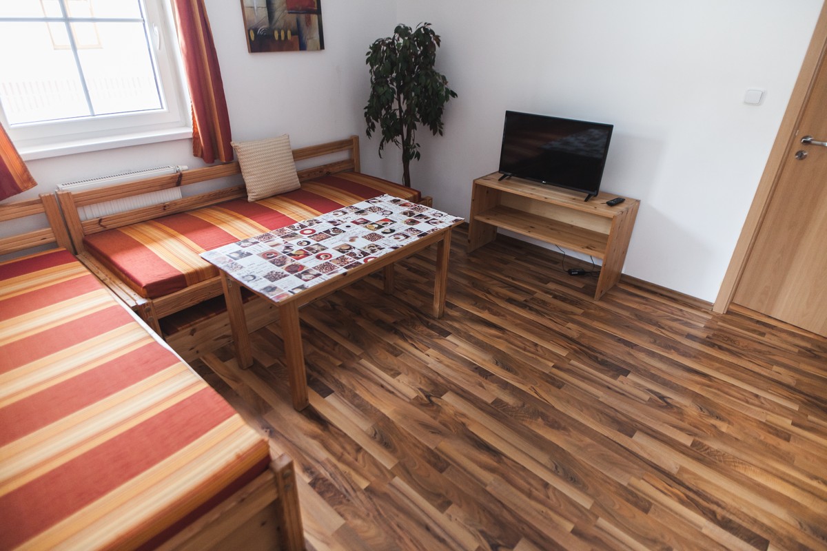 Nabízíme ubytování se stravou v pohodlných apartmánových bytech. Součástí těchto apartmánů je předsíň, obývací pokoj (TV) + kuchyňský kout, samostatná ložnice (1-3 ložnice dle velikosti apartmánu) a sociální zařízení se sprchovým koutem. Připojení na internet přes WiFi je přístupné po celé budově.